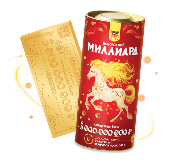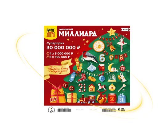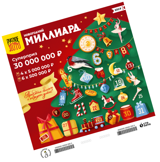 В тираже «Новогодний миллиард» от «Русского лото» гарантированно будет разыгран 1 000 000 000 ₽, несколько выигрышей по 1 000 000 ₽ и другие крупные призы. Не упустите шанс поймать удачу за хвост!
